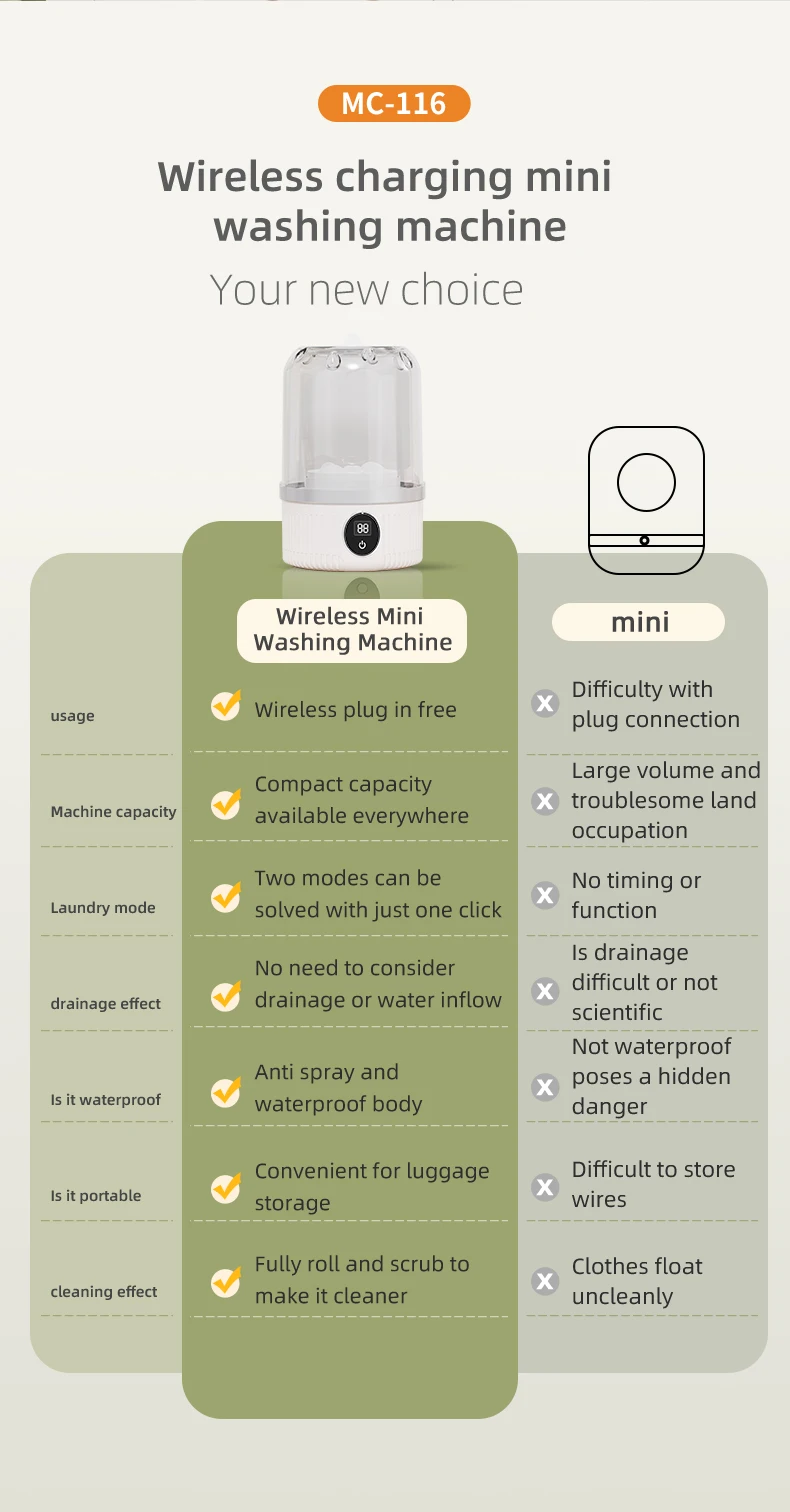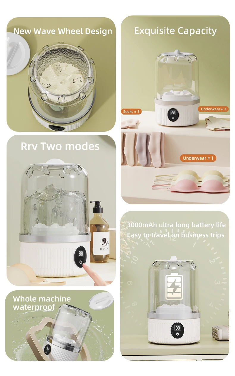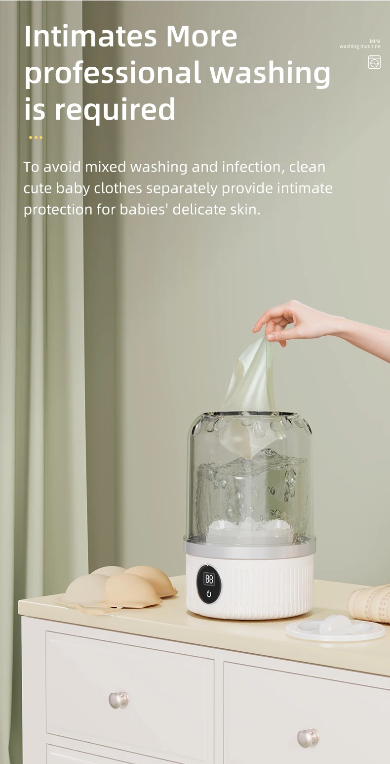 This portable mini washing machine is designed for those who need a quick and hygienic wash anywhere. Perfect for underwear, baby clothes, socks, and delicate garments, it helps prevent cross-contamination by keeping intimate items separate from daily laundry. The foldable, lightweight body fits easily into luggage, making it ideal for travel, camping, RV trips, dorm rooms, and small apartments. With USB rechargeable power, you can wash clothes without relying on a wall outlet. Its gentle yet effective cleaning keeps fabrics safe while ensuring freshness on the go.